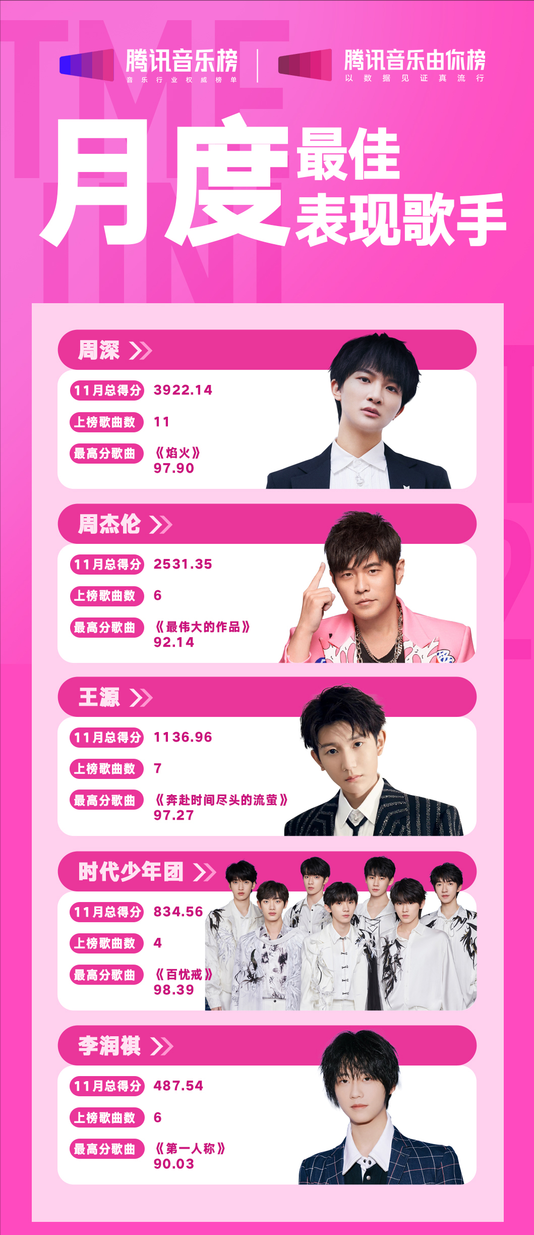 近日,腾讯音乐娱乐集团旗下腾讯音乐榜子榜单之一,腾讯音乐由你榜发布了11月回顾,盘点了第44-48期榜单成绩。11月,周深凭借出色的演唱实力拿下三期冠军,时代少年团也展现非凡才华拿下两期冠军。周杰伦、王源、李润祺等获得月度最佳表现歌手,并且其专辑均入选月度最佳表现专辑。