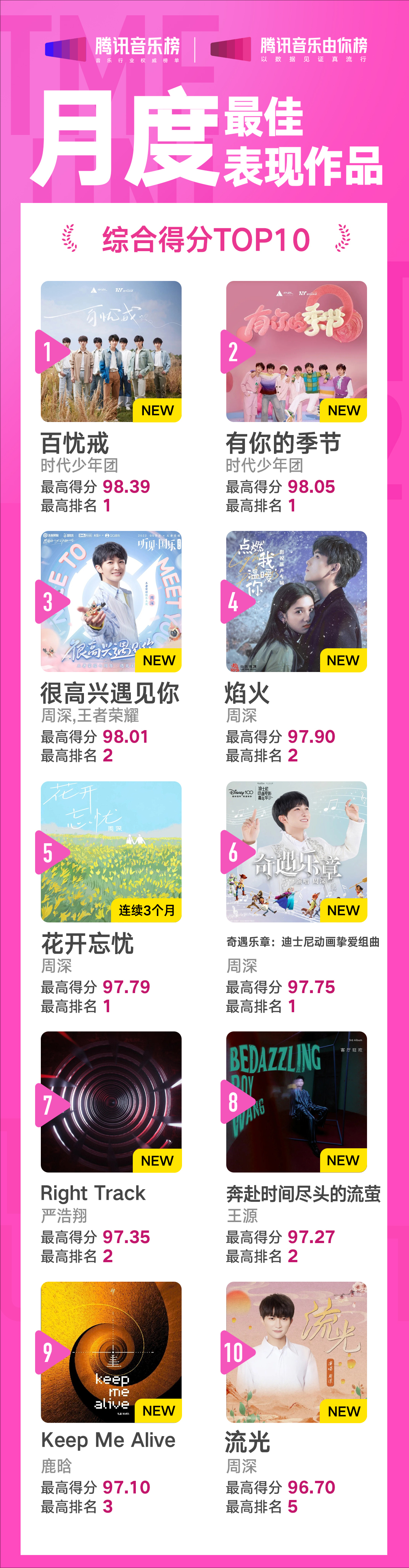 而依照综合得分排名的TOP10月度最佳表现作品中,时代少年团展现了青春的力量,凭借《百忧戒》和《有你的季节》两首歌曲拿下冠亚军。其中,洋溢着少年气息的《有你的季节》还获得腾讯音乐由你榜第47期冠军,并且凭借此曲打破纪录,成为腾讯音乐由你榜夺冠歌曲数最多团体和夺冠次数最多团体。
