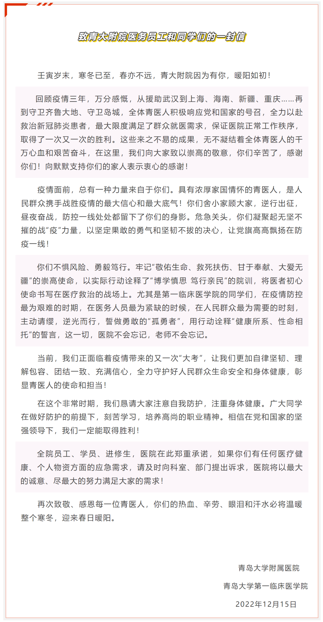 新征程,新使命。当前,虽然我们正面临着疫情新形势带来的“大考”,全体青大附院人更加坚韧勇毅、理解包容、充满信心,彰显青医人的使命和担当!在院党委、院行政的坚强领导下,全院党员干部、医护员工将更加紧密地团结在一起,坚守“不忘初心、牢记使命”政治站位,坚定“生命至上、人民至上”崇高理念,发扬“敢打硬仗、能打胜仗”优良传统,激发“勇于担当、主动作为”干事劲头,踔厉奋发,全力以赴,为守护人民群众生命健康做出新的更大贡献。