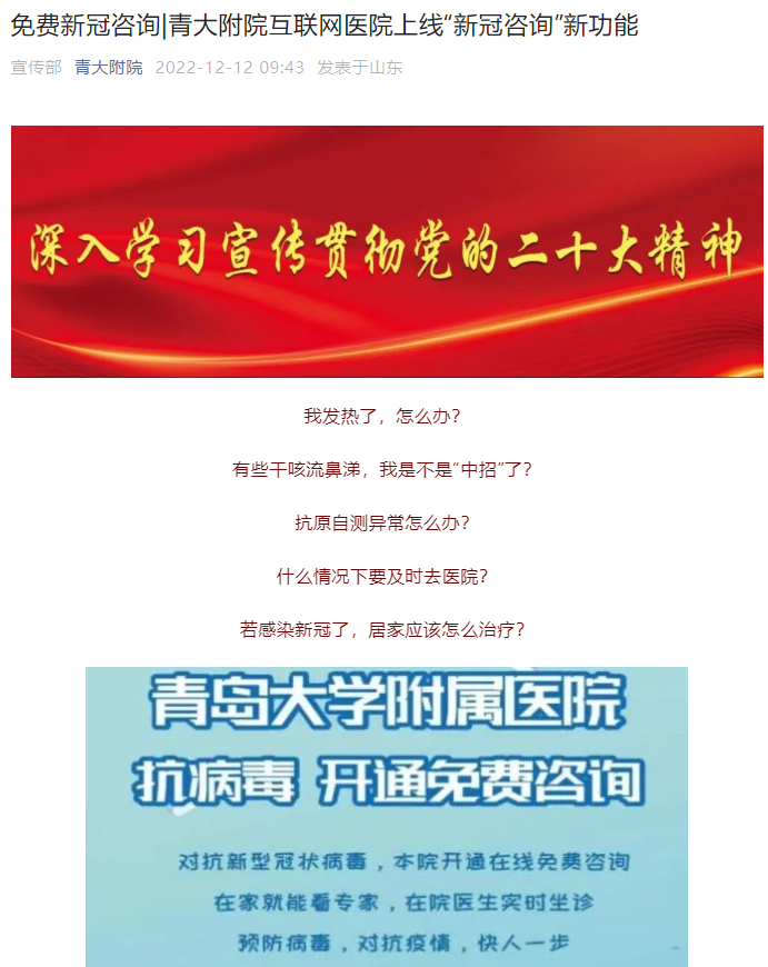 青大附院互联网医院在已开通图文问诊系统服务项目(即为复诊患者提供病情咨询、报告解读、基本药物递送等服务)的同时,上线免费“新冠咨询”新功能。“新冠咨询”网络门诊,由呼吸内科、重症医学科等临床一线、具有新冠救治经验的骨干医师组成新冠咨询团队,免费提供专业的新冠防治建议及科普讲解,帮助患者答疑解惑。目前每天有至少35名医生在线为患者提供咨询,截至12月20日,新冠咨询门诊问诊量为5000余人次,平均每天大约600余人次在线咨询。医院将继续增加人力物力,及时开通新的就医及问诊模块,满足人民群众不断增加的就医需求,体现青大附院护佑人民健康的责任与担当。
