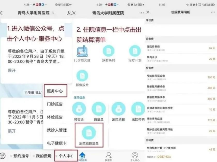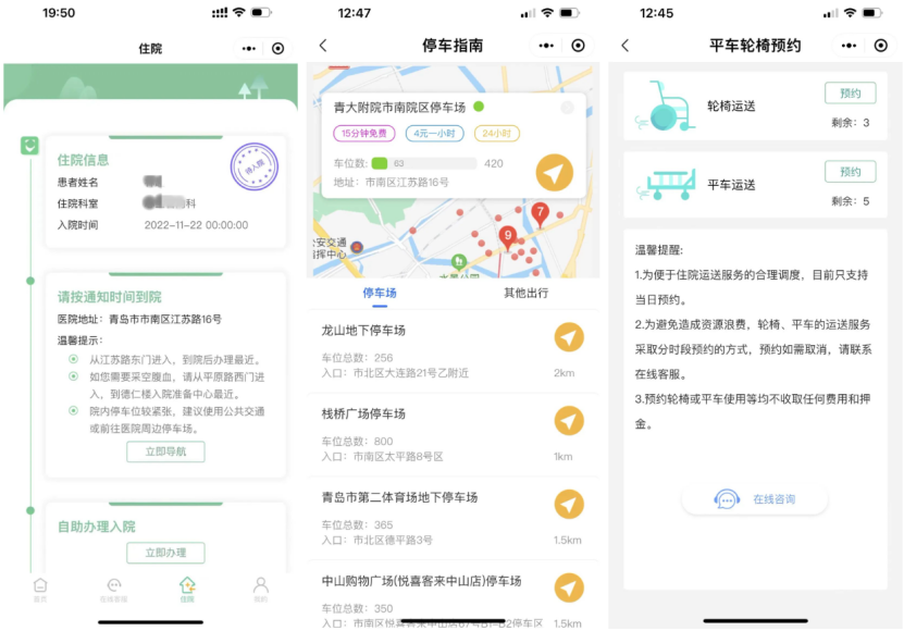 站在患者就医全方位需求的角度,医院不断优化住院患者服务工作流程,推出涵盖自助入院办理、自助床旁结算、定制性入院服务、出院诊后延展服务等功能的患者诊疗及周边服务生态圈全场景出入院服务。患者朋友只需要提前关注“青岛大学附属医院”公众号和小程序,在手机上就可以享受到入院、出院全流程的主动服务推送,按照信息指引即可自助办理出入院,实现“零跑腿”“一次办好”。目前一站式全场景智慧自助出入院服务已经在青大附院五个院区全面推开实施。