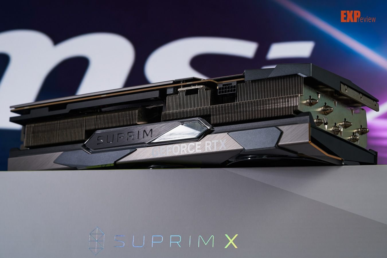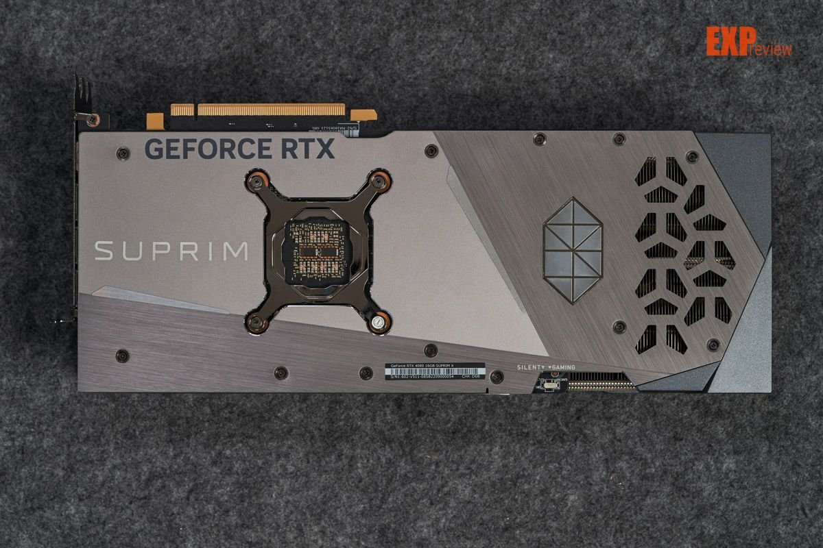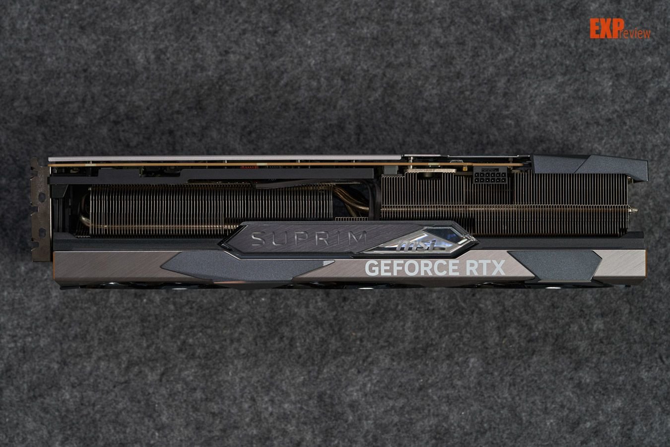 显卡的顶部设计也是同样的有现代感。SUPRIM字样的灯版上仍然是采用了拉丝处理工艺,配合下方的GEFORCE RTX字体很是好看。顶部这里也能看到有超大面积的开口来排散热,配合体积如此巨大的散热器想来温度表现应该是不错的。