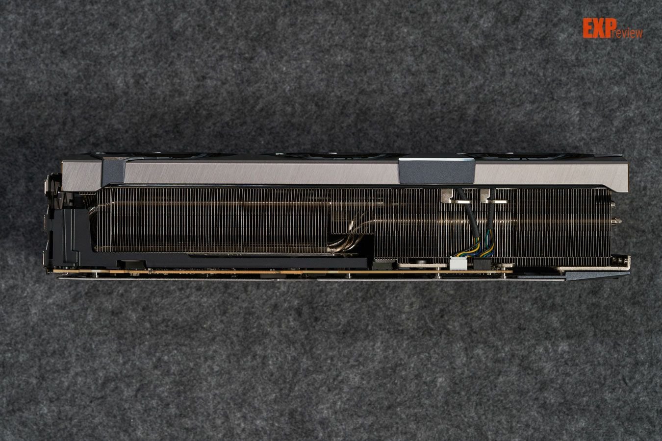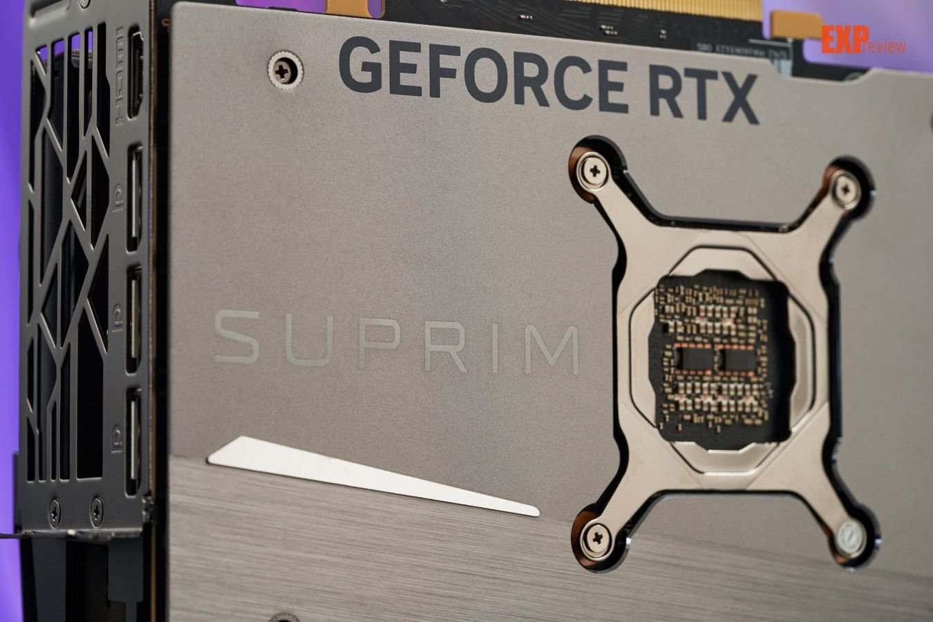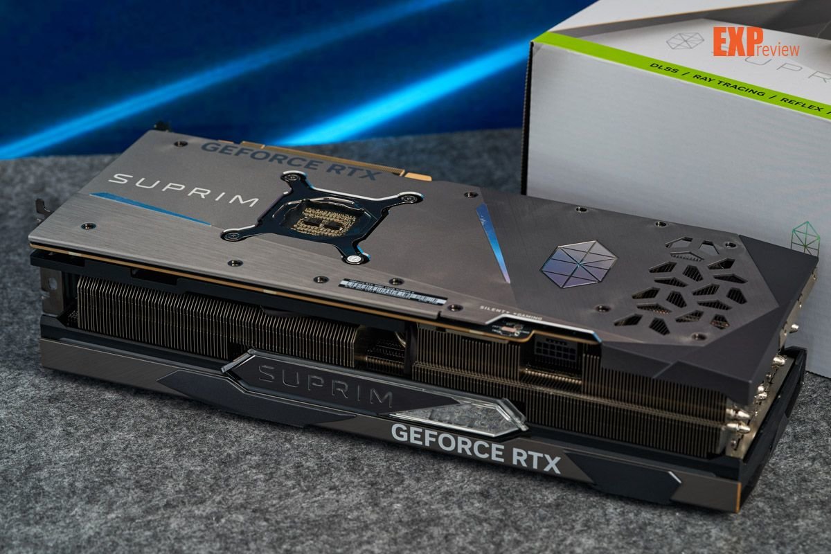 显卡的顶部设计也是同样的有现代感。SUPRIM字样的灯版上仍然是采用了拉丝处理工艺,配合下方的GEFORCE RTX字体很是好看。顶部这里也能看到有超大面积的开口来排散热,配合体积如此巨大的散热器想来温度表现应该是不错的。