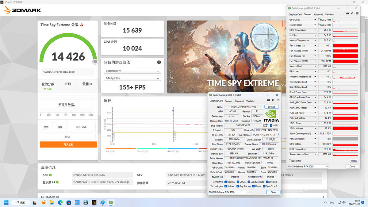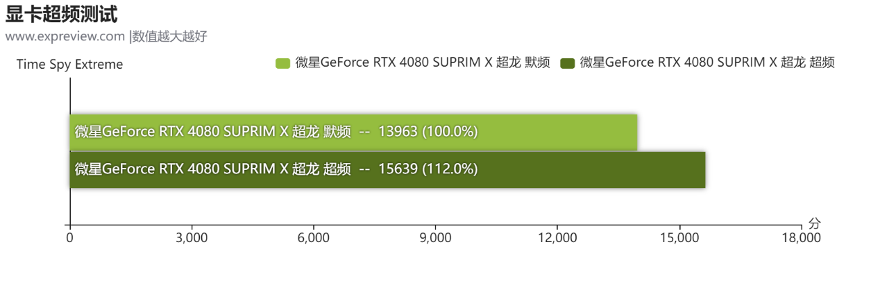 在这个超频幅度之下,显卡的3D MARK Time Spy得分从13963分提升至15639分,得分提升了10%有多。对于一张出厂已经预超频这么多的显卡来说也算是一个不错的成绩。