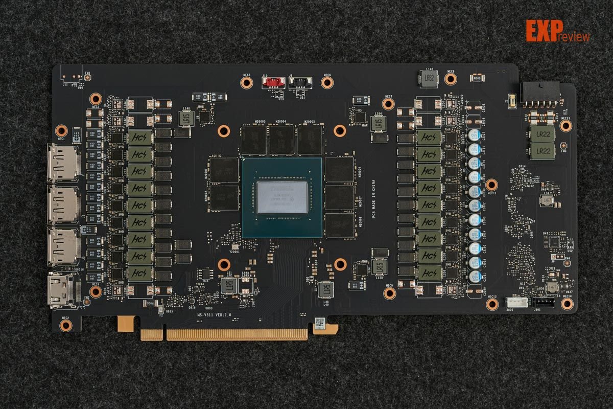 正如目前很多的很多非公版RTX 4080显卡一样,这张微星GeForce RTX 4080 SUPRIM X 超龙的PCB也是属于越肩之余长度不算很长。右上角是放置12VHPWR供电接口的开口,而PCB中央则是那个RTX 4080的AD103-300-A1 GPU核心,旁边则是8颗每颗2GB容量的美光GDDR6X显存。16GB的显存在目前的4K游戏之下是比较不错的配置,基本上不会出现炸显存的情况。