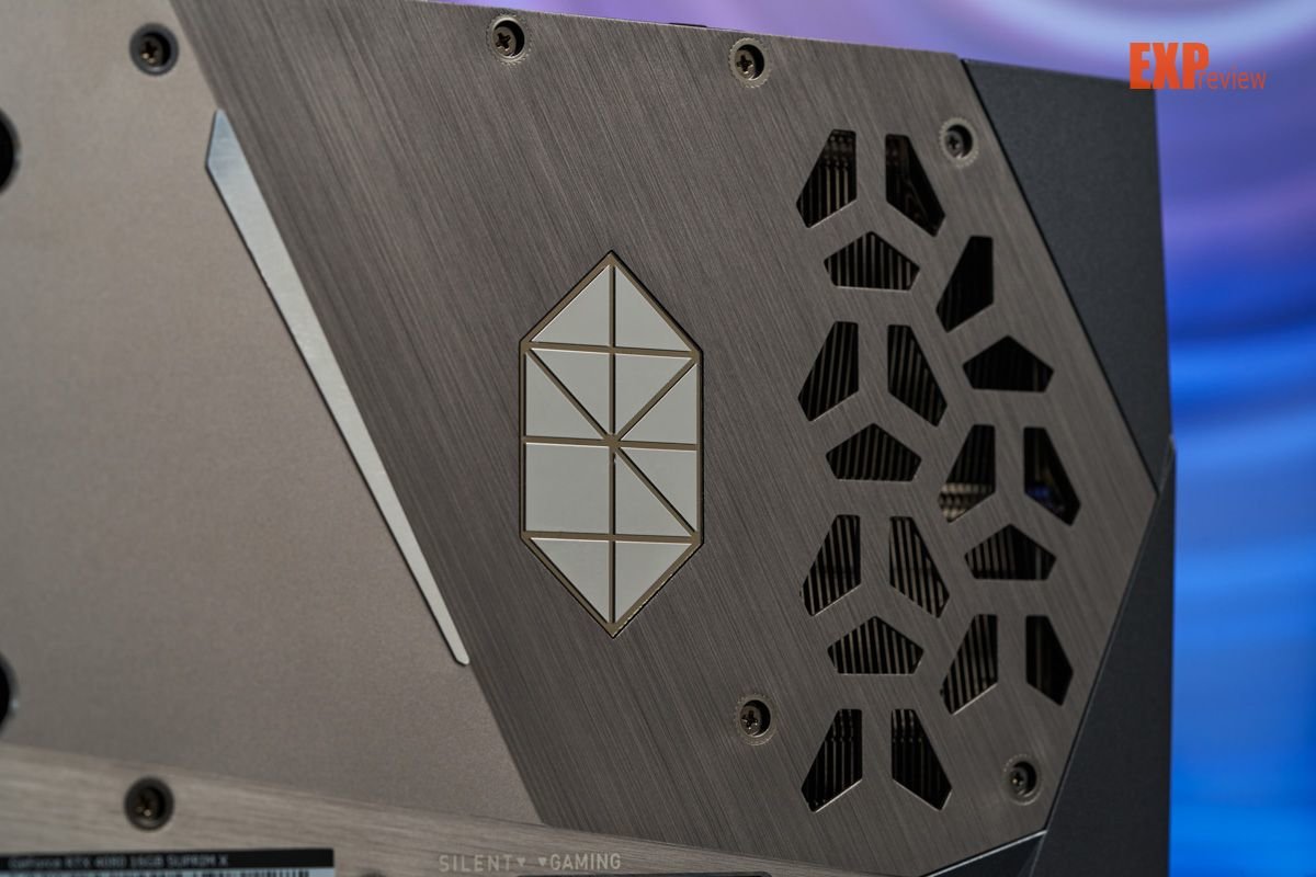 来到显卡的背面,这里我们可以看到微星GeForce RTX 4080 SUPRIM X 超龙上的第三种颜色,那就是暗金色,而不同颜色的几何设计也与正面相呼应。背板末端拥有一些用于辅助热气排出的开口,这点似乎也是众多RTX 4080非公版显卡的一个共识了。