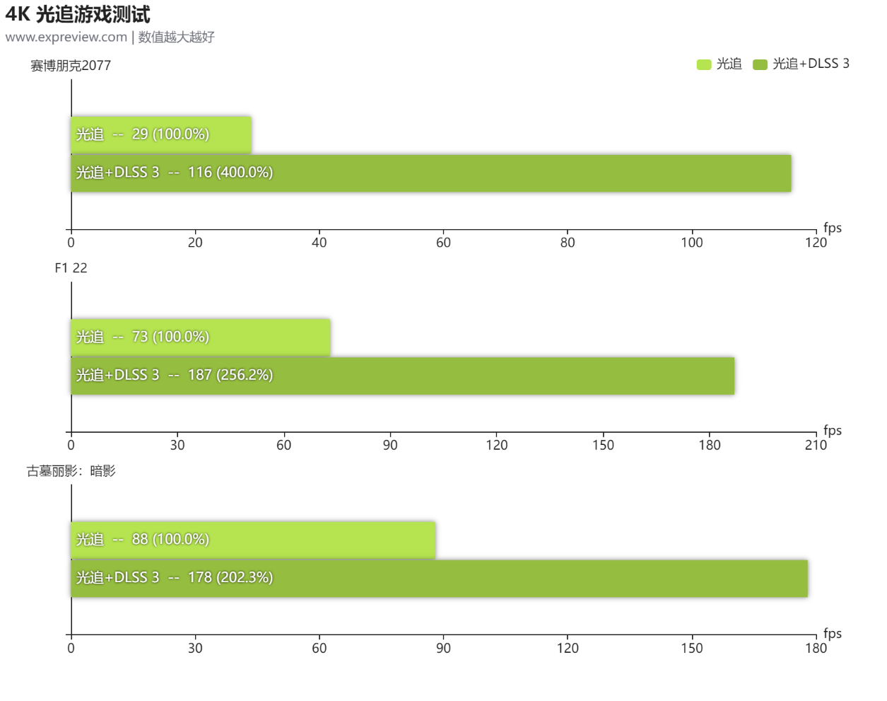 很显然,除了对于硬件要求很高的《赛博朋克2077》只有30帧左右之外,其他两款游戏的帧数都达到了70几80的水平,一下子就超过了60帧流畅可玩的程度。而如果玩家是追求更高帧数,那么可以打开DLSS 3,打开之后帧数都可以基本上翻一翻,像是《赛博朋克2077》更加是翻了好几倍,这时候的画面流畅度就远比60帧要好了。