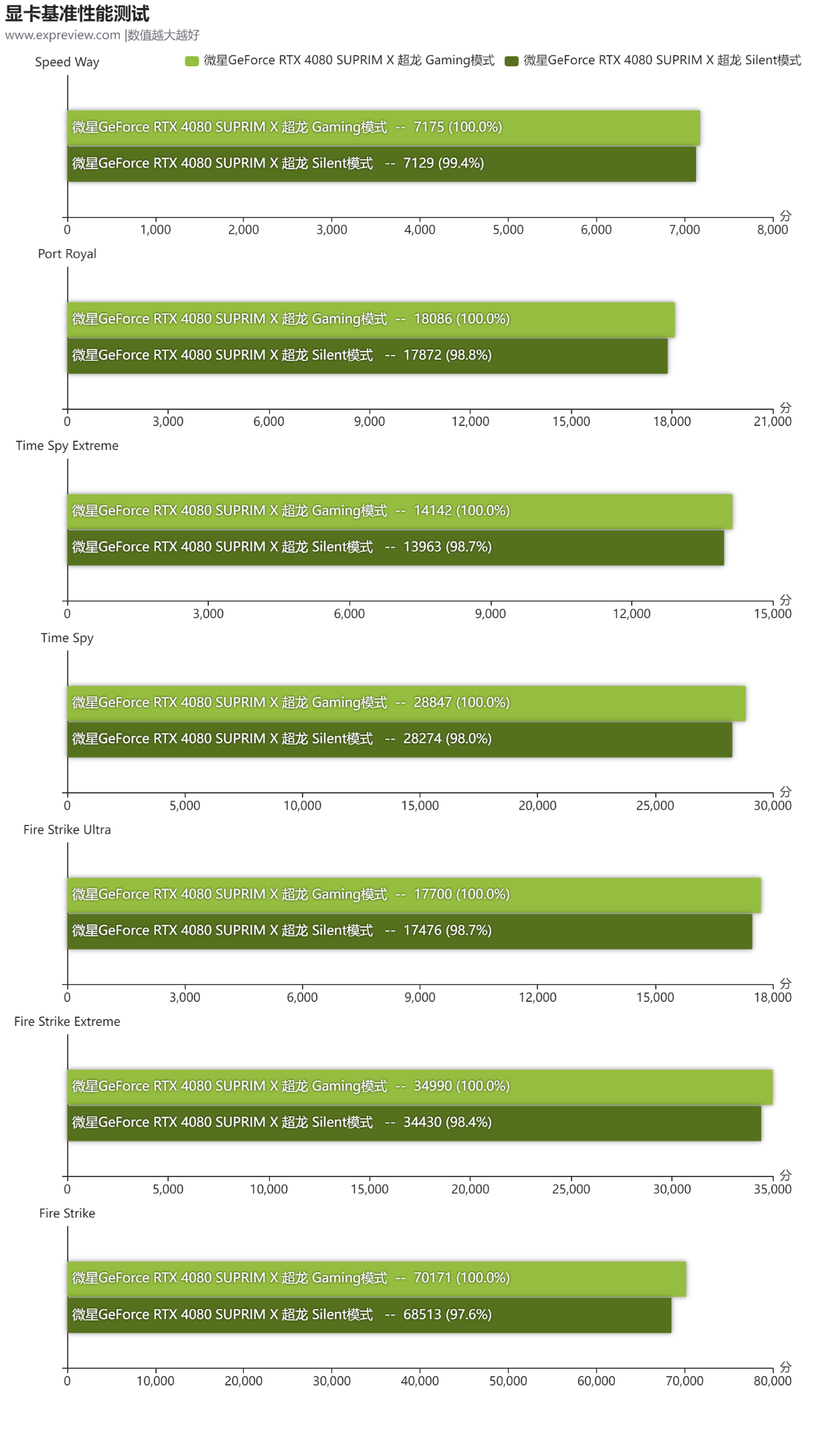 而由于微星GeForce RTX 4080 SUPRIM X 超龙拥有2个BIOS,因此我们在这里也是会测试一下两个BIOS的理论性能。