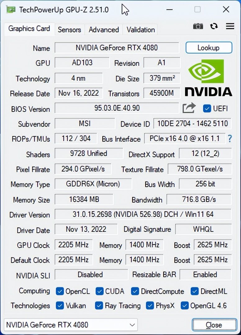 显存的规格也是与公版RTX 4080无异,均为22.4Gbps、位宽为256 bit的16GB GDDR6X。另外CUDA核心数也是同样的9728个。