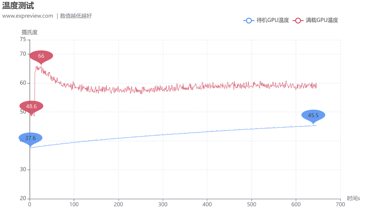 在这个环节中,笔者会以开放式平台来测试显卡的温度,测试时环境温度约为23℃。满载温度是在3DMark Time Spy Extreme测试中取得的,而待机温度则是开机以后记录10分钟。