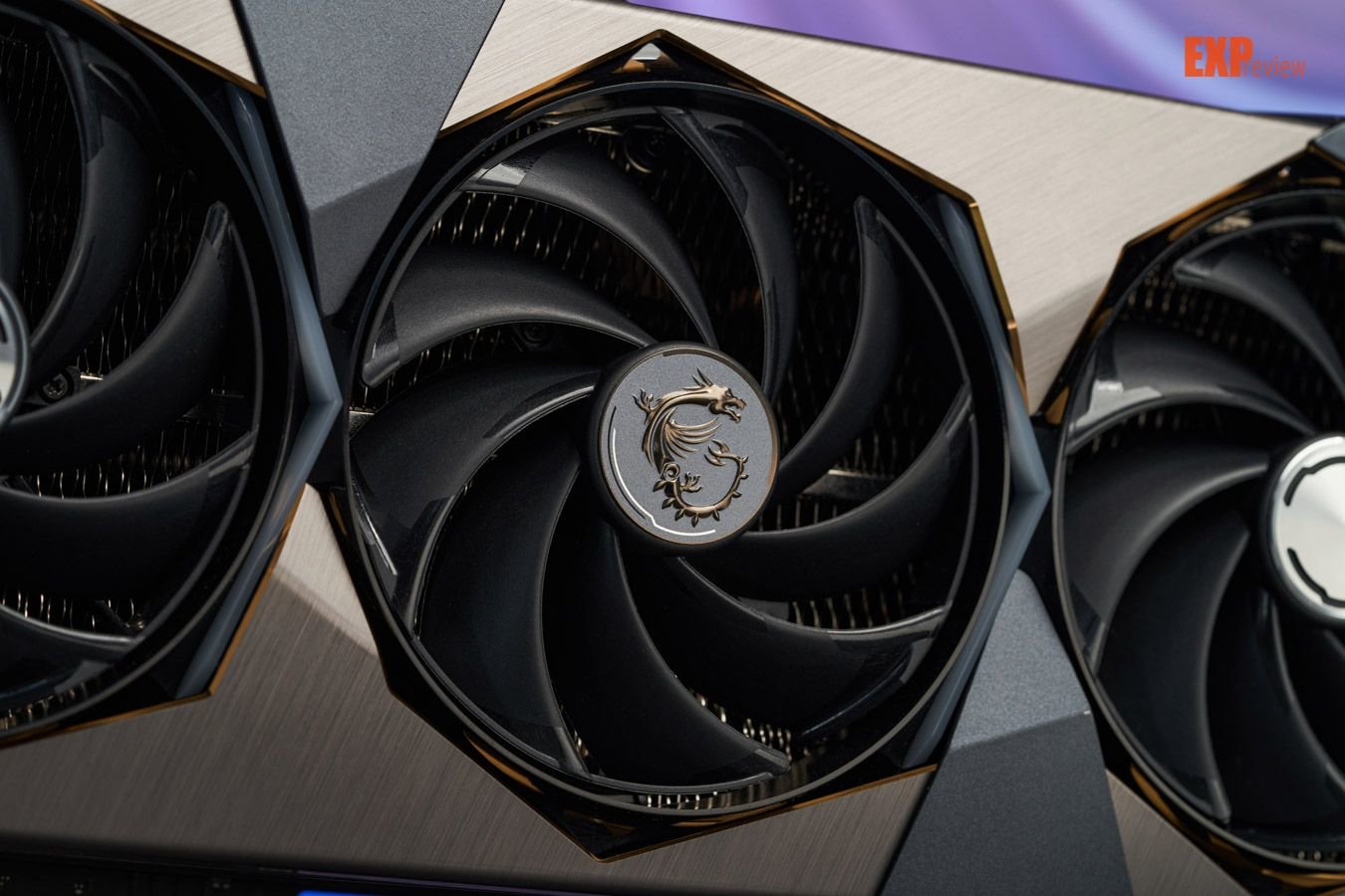 这次微星GeForce RTX 4080 SUPRIM X 超龙所使用的风扇也是挺有意思,因为与其他扇叶末端连在一起的风扇不同,这3把风扇是每3个扇叶连接成环形,并且连接处的尾部还有向内侧折折的设计,官方表示这样可以减少空气阻力。