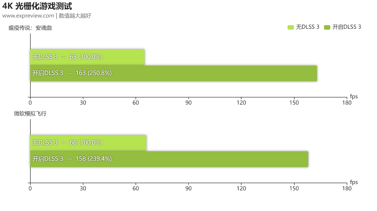 在游戏选择方面,光栅化游戏是选择了《瘟疫传说:安魂曲》以及《微软模拟飞行》这两款游戏来进行测试。由于RTX 40系显卡另一个卖点是DLSS 3技术,因此这里也是进行了开关DLSS帧生成及DLSS性能模式的对比。
