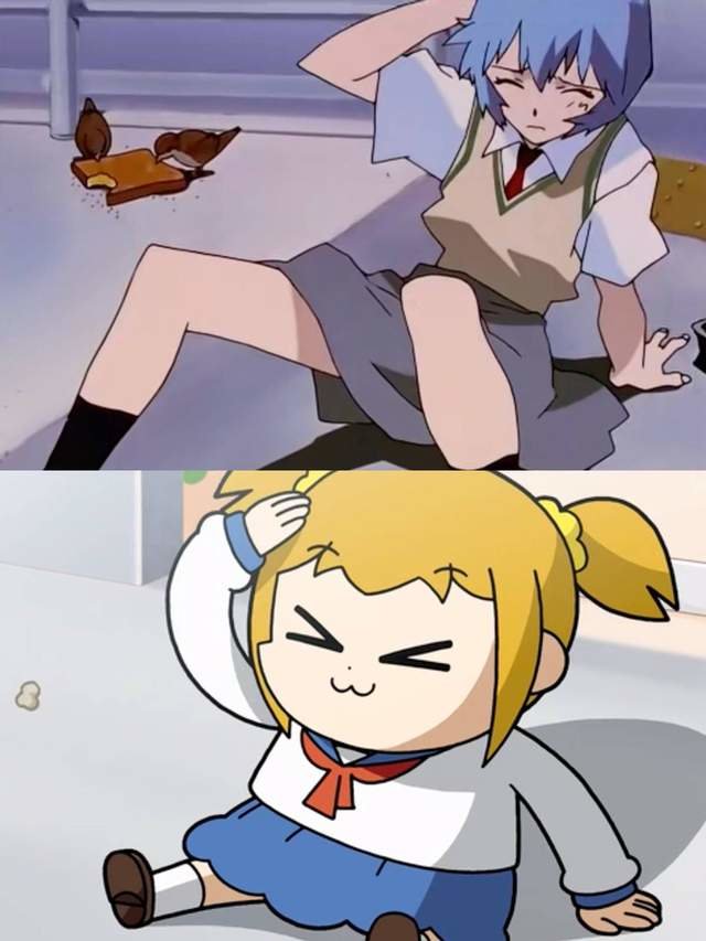 《pop子和pipi美的日常》种种不按牌理出牌的剧情发展,成为其出圈秘籍,作品内恶搞的动画、电玩作品梗不计其数,年代也遍布各个世代。人物形象更是表情包的常客。在第一集就复刻了凌波丽与碇真嗣在转角相撞的场景。