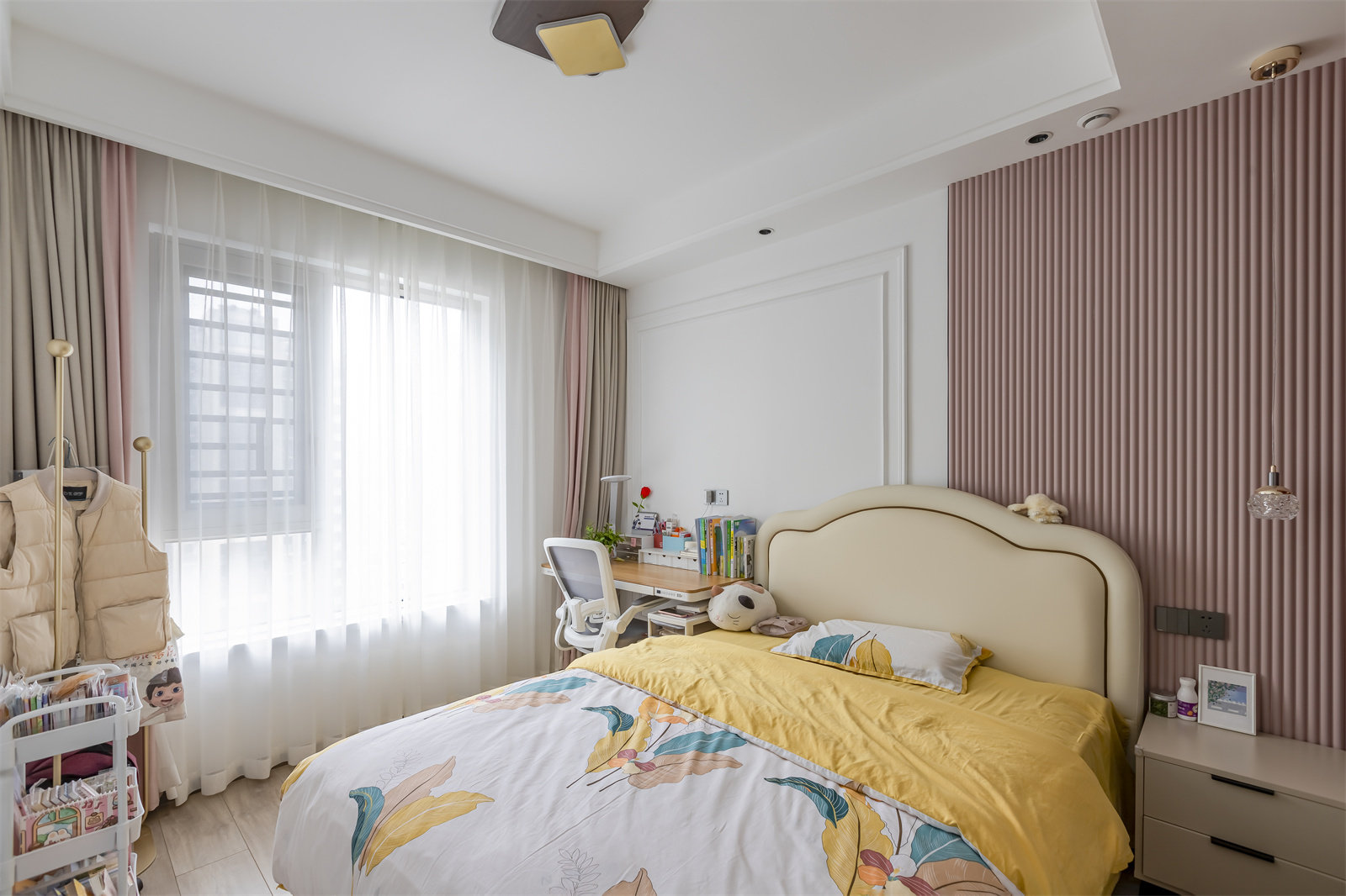 女儿房以白色为底,粉色衬托,显得温馨又浪漫。波浪板的造型,加上石膏线条的刻画,愈加丰富了空间层次。一侧床头打造开放式储物格,更方便收纳置物。