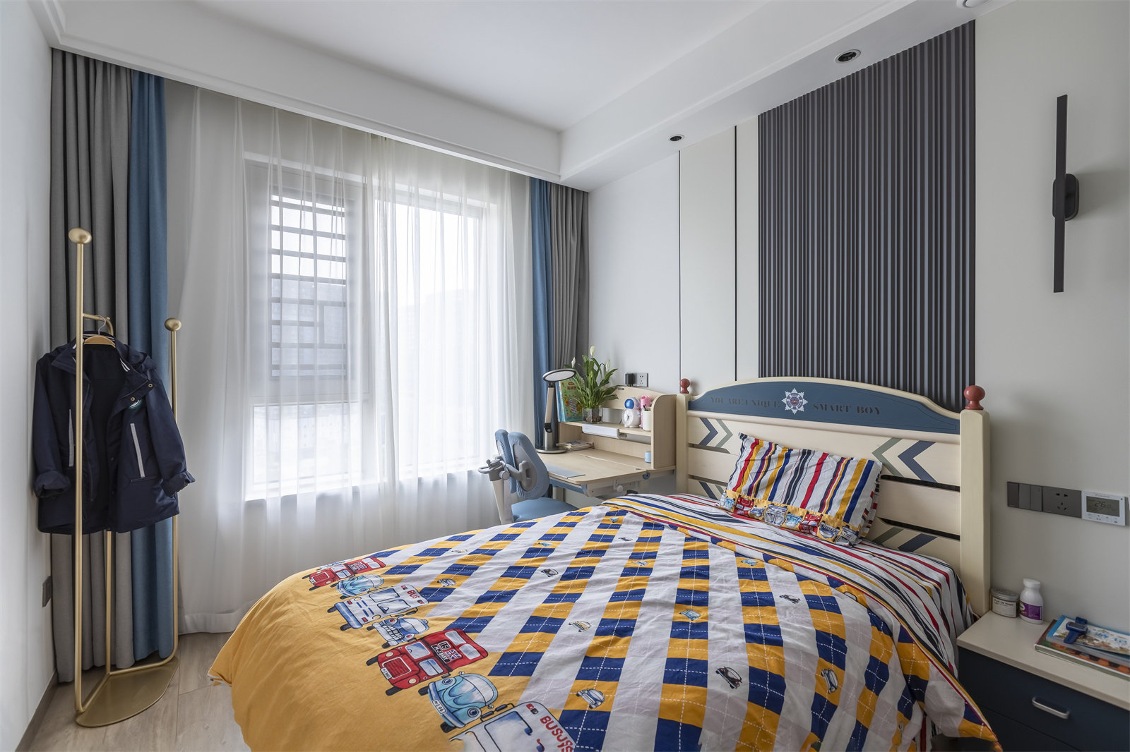 男孩的房间以蓝色调为主,完美打造出惬意空间。房间墙面用到墙板+木饰面的材质,品质感很不错。床头一侧则摆放了儿童学习桌椅,保障了孩子的日常学习生活。衣柜里侧设计开放格,目前是放置了几盆绿萝,更好净化室内空气,后期可以摆放装饰物和书籍,方便居家使用!