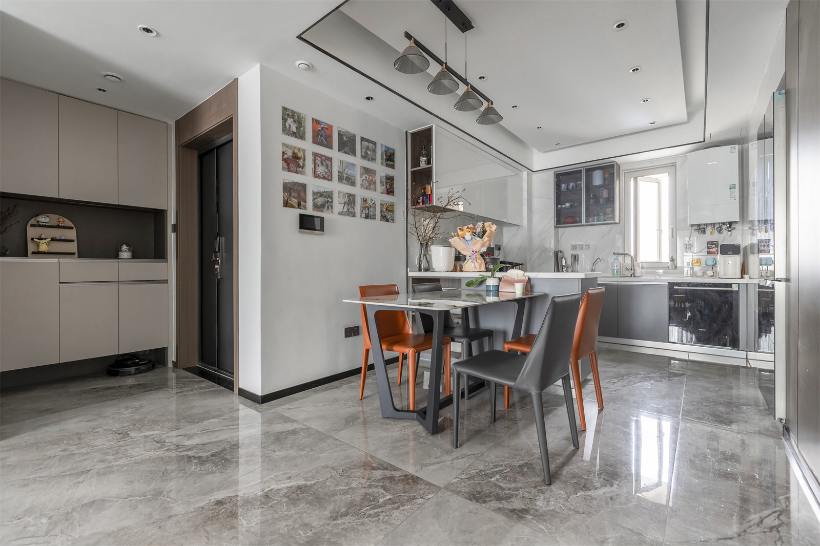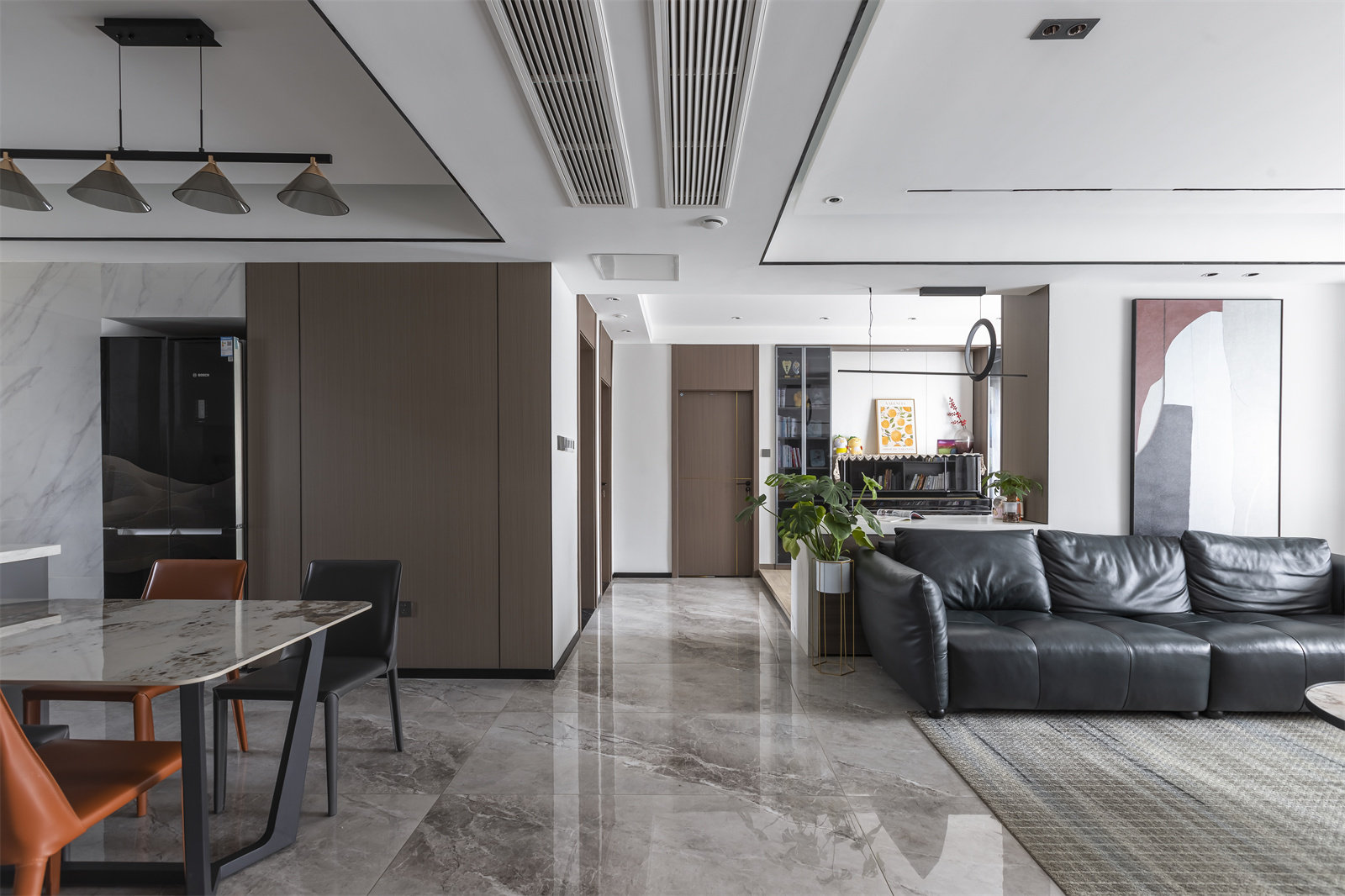 开放式餐厨的布局,直接打通了餐厅、厨房。由此实现全开放的空间结构。餐厅正面是木饰面装饰的墙面,增添更多的生动气息。冰箱内嵌入墙,不占地方的同时,更好地提升了家居动线。