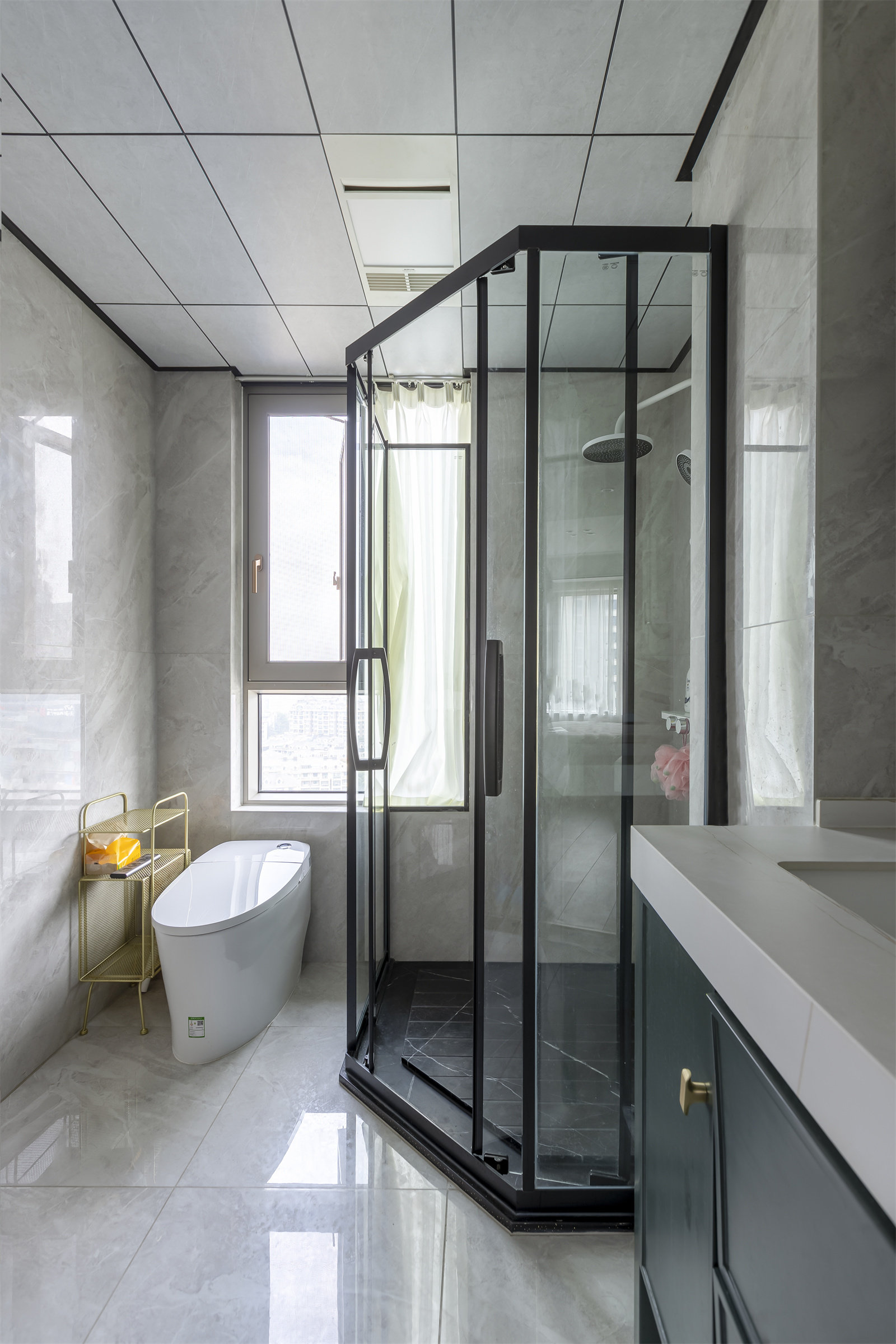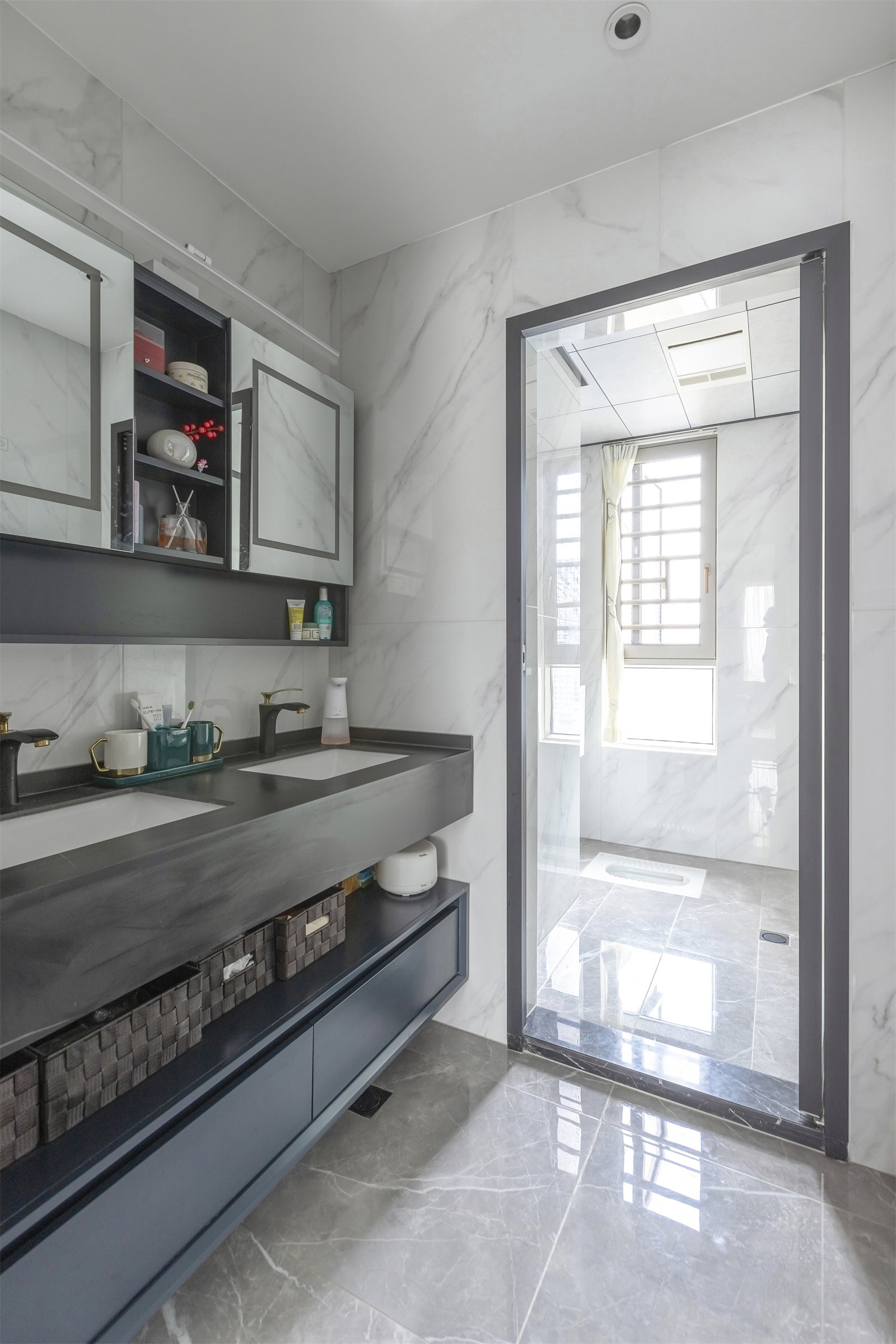 公共卫生间有效实现了干湿分离,整体利用率也大幅提升。由于家里有两个孩子,上学时间又比较接近,为防止争用卫生间情况的发生,卫生间做了双台盆的设计,更方便日常洗漱。浴室柜底部悬空,同样能满足实际储物的需求。