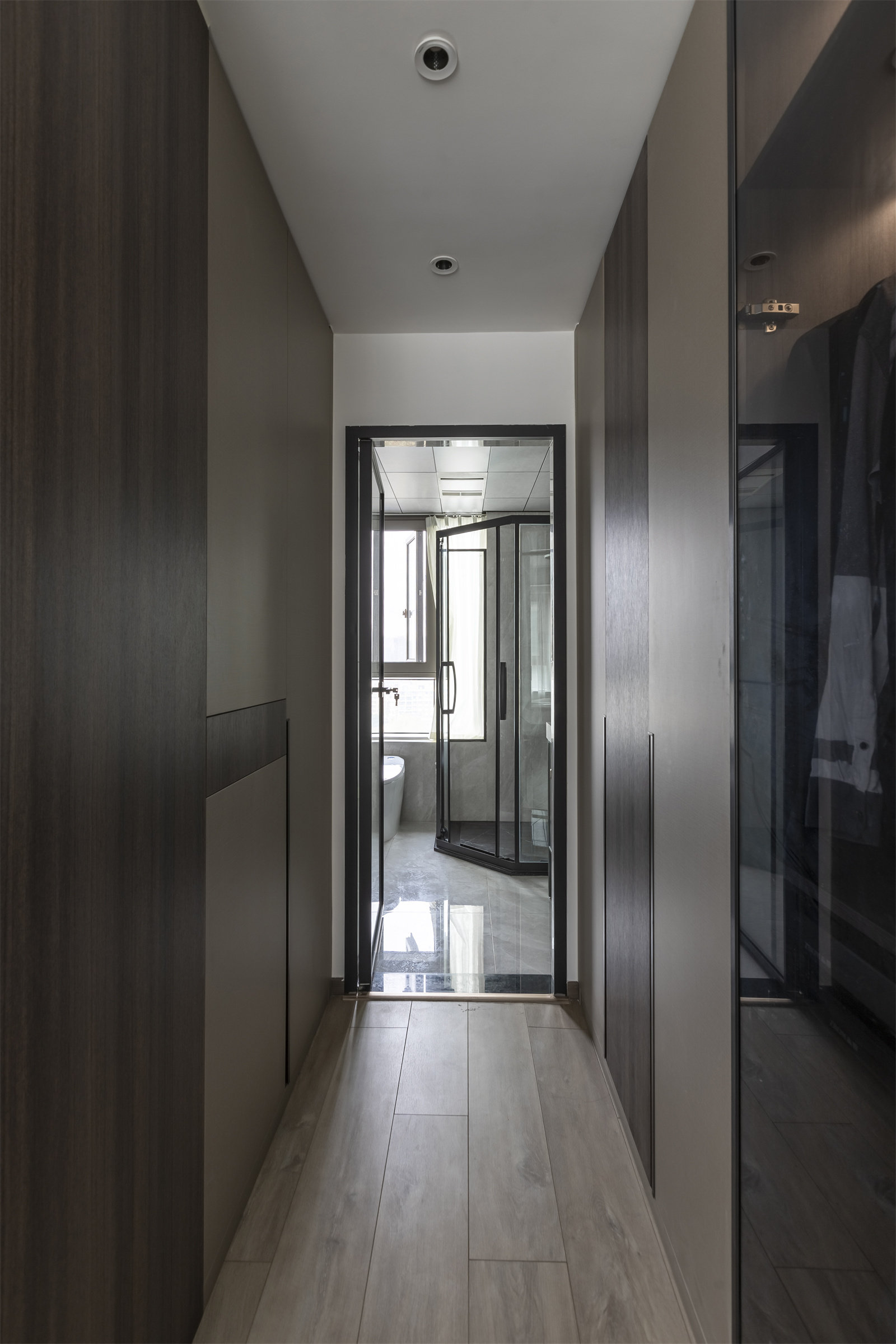 将卫生间设计与卧室一体,增大了卫生间内的舒适性。其间还存在一条衣柜走廊,里面存放着不同季节的服装服饰,充沛的储物量让业主省去了不少心力。