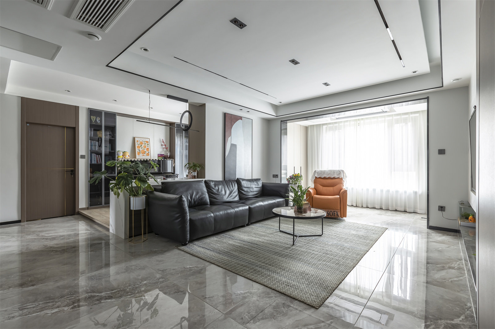 打掉原有阳台移门,整个将阳台与客厅连结起来,增加互动空间的同时,室内变得愈加明亮。天花无主灯的设计,让顶面更加简洁干净,视觉上显得层高更高,光线更均匀。