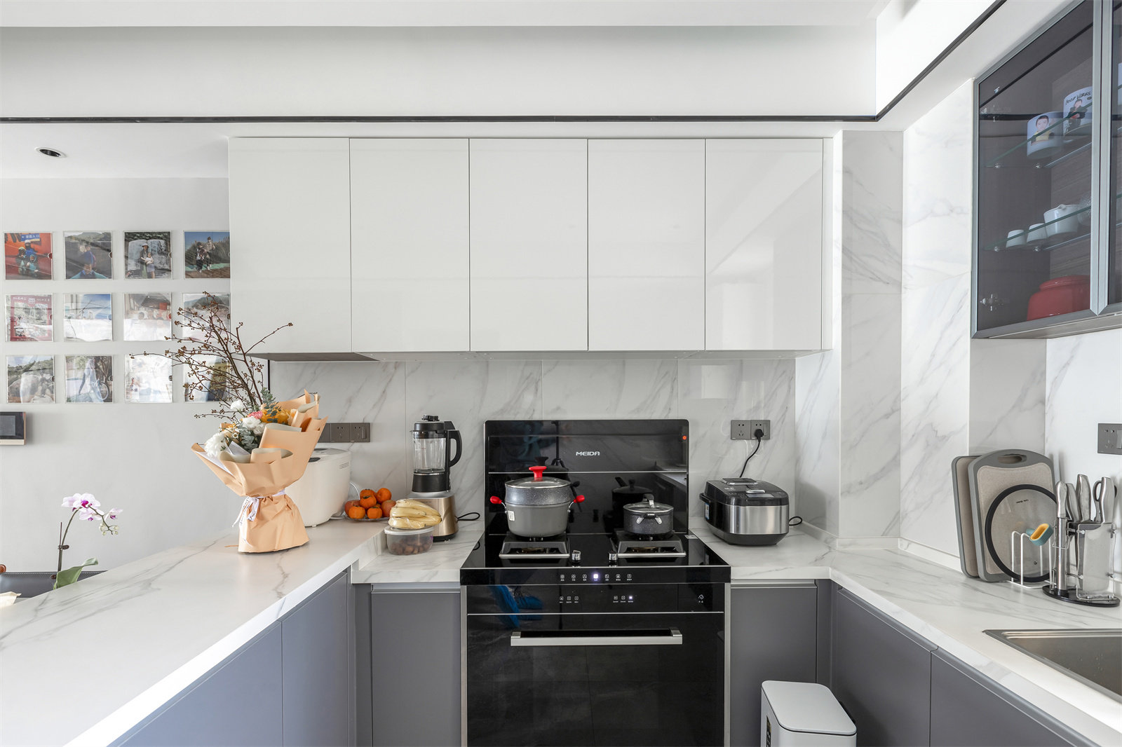 开放式厨房是这套房子中最亮眼的地方,U型的橱柜布局,功能区分布精致又小巧。上白下灰的橱柜搭配白色墙砖,显得异常干净。厨房的布局采用高低台设计,更好地符合业主的烹饪习惯。烤箱、冰箱等厨房家电准备就绪,与柜体保持一致,将使用空间和颜值最大化。
