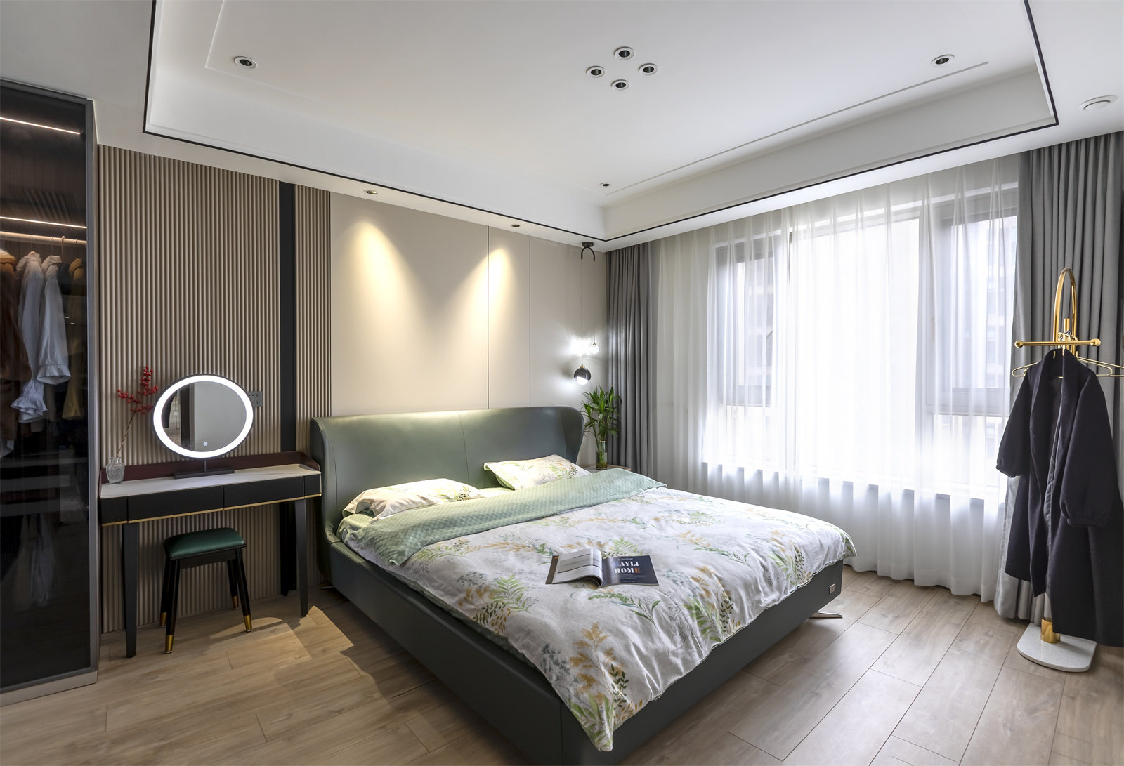 主卧整体面积偏大,应业主的实际需求,在卧室里设计出衣帽间及卫生间,构成套间的形式。彼此之间相互独立,互不干扰,能够更好地为业主提供服务。顶部照例无主灯设计,见光不见灯,氛围感直接拉满。
