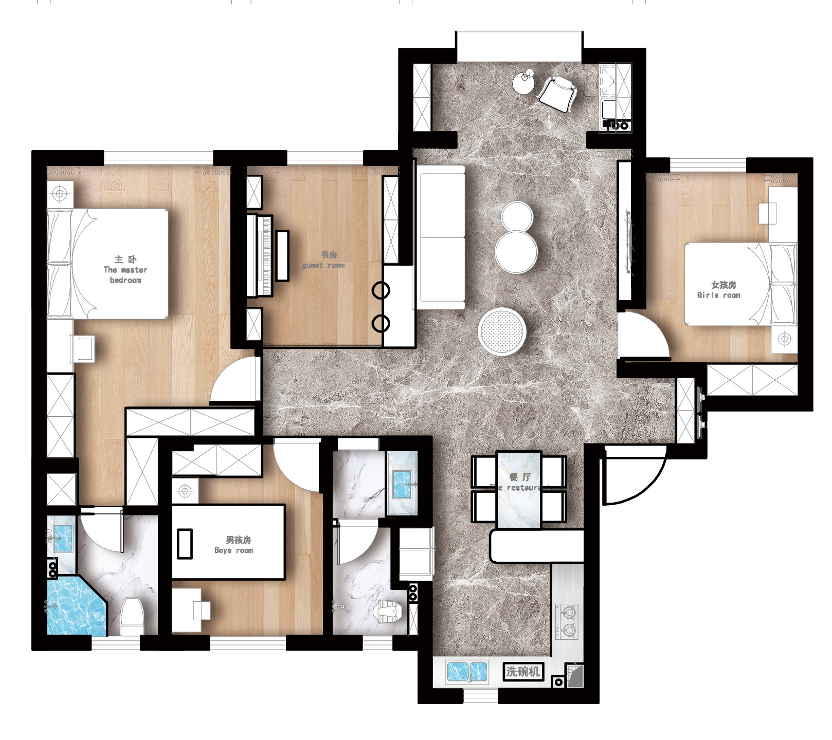 (3)公共卫生间实现了干湿三分离,更方便一家四口的日常洗漱使用。