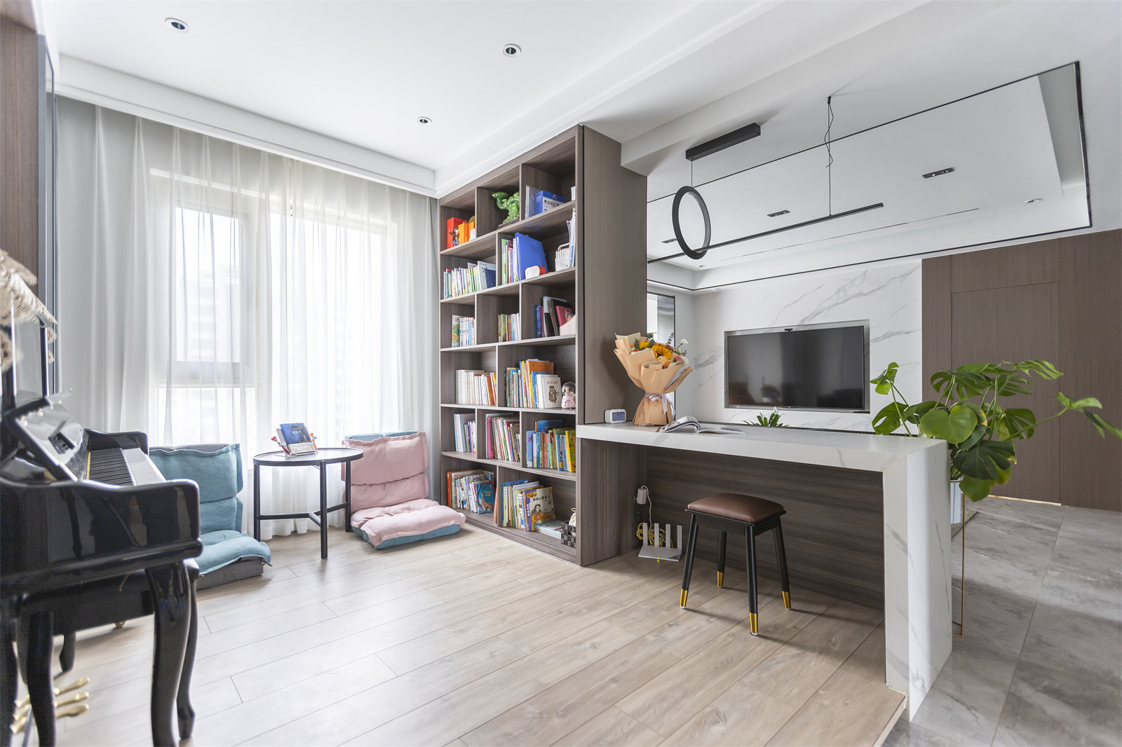 这里也是孩子的学习区。侧面打造了一整面的书柜墙,里面摆满了各种书籍读物。旁侧还配置小的桌椅靠垫,作为阅读角,丰富着孩子的课余生活。除此之外,还有一座大钢琴充当C位,充分陶冶孩子的生活情操,培养更多的兴趣爱好。