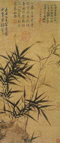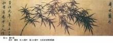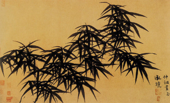 明末清初的石涛(1640——-约1718),原名朱若极,生于乱世,原是桂林晴靖王的子孙,出家为僧,更名原济、元济、超济、道济,字石涛,号大涤子、清湘老人、清湘陈人。石涛画竹,笔意纵恣,脱尽窠臼,开墨竹写意画风气之先。石涛画竹多用生宣纸,用笔奔放,水墨淋漓,浓淡干湿,千枝万叶,一气呵成,纵笔直写,略无滞塞,历代沿袭之宫苑庭园气象,都被他的如椽大笔扫荡殆尽,而骤雨狂风之势,滴露笼烟之态,则一一奔来笔底,人称“野战”。石涛天资极高,所画墨竹,不拘泥于形似,以势取胜,给人以耳目一新之感。
