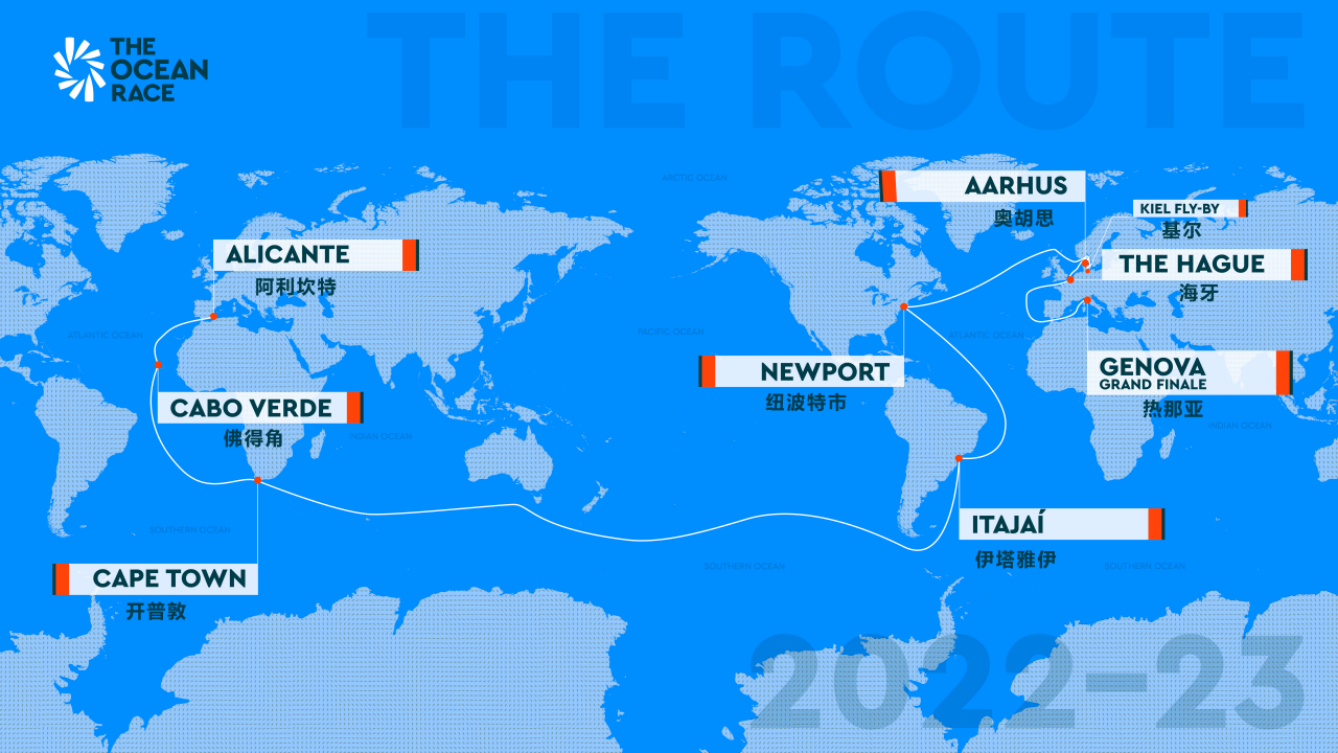 本次环球帆船赛将从西班牙阿利坎特出发,经佛得角、南非开普敦、巴西伊塔贾伊、美国纽波特、丹麦奥胡斯、荷兰海牙、最终到达意大利热那亚,全部赛程共计180天左右。