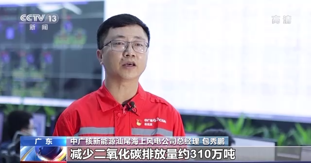 中广核新能源汕尾海上风电公司总经理 包秀鹏:中广核汕尾140万千瓦海上风电大基地全面建成投运,每年可提供清洁电能约40亿千瓦时,可等效节省标煤约127万吨,减少二氧化碳排放量约310万吨。