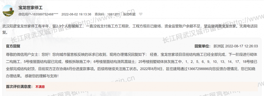 但在2022年8月,该项目被爆停工有半年,根据城市留言板官方回复显示,经查,宝龙世家项目目前结构施工已经全部完成,下一阶段进行砌体二构施工,5号楼屋面结构层已完成,模板拆除施工中;6号楼屋面结构浇筑混凝土;25号楼别墅砌体抹灰施工中,1、2、5、6、9、10、13、14、17、18号楼已全部完成结构封顶,目前双方正在协商8月份进度款事项。