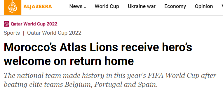 作为首支晋级世界杯四强的非洲球队,摩洛哥队在本届卡塔尔世界杯的表现让人们印象深刻,先后击败比利时、西班牙、葡萄牙等强队,虽然未能将“黑马”之路进行到底,但这支北非劲旅用流畅的攻势足球令世界足坛尊重。摩洛哥世界新闻网站提到,摩洛哥皇室一直是这支球队的忠实拥趸,在球队1/8决赛中爆冷击败西班牙后,摩洛哥国王穆罕默德六世也参加了街头的庆祝活动。