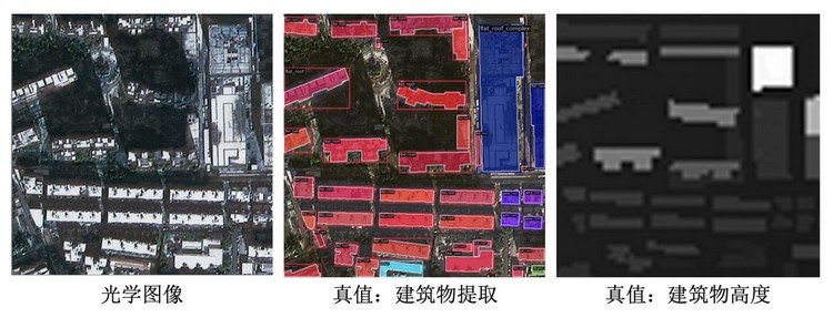 赛道二:面向多任务学习的城市建筑物提取与高度估计。该赛道旨在从高分辨率光学和SAR卫星图像中实现建筑物的提取与高度估计,探究多任务联合学习间的特征共享与信息互补机制。真值数据包括建筑物提取信息与nDSMs信息。