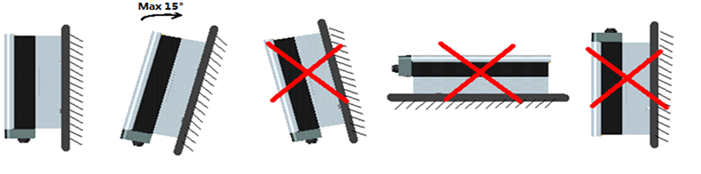 请按如上图标示安装逆变器,建议在垂直不超过15度角方向安装逆变器。