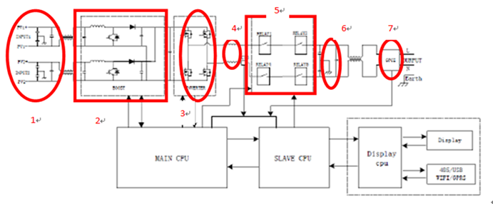 升压部分,上图对应2,用于将电池板输出的低直流电压升至高直流电压,用以逆变。