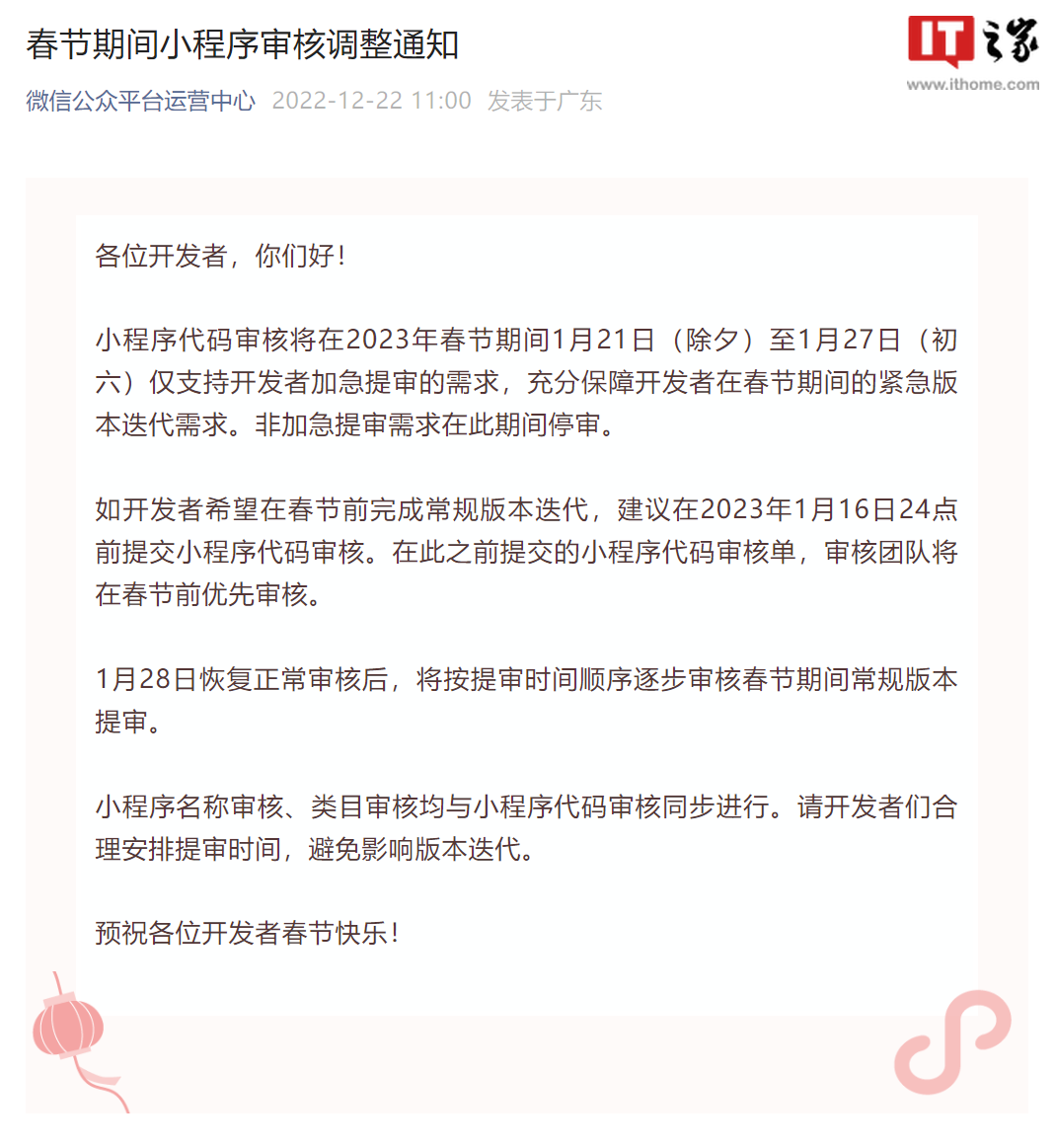IT之家 12 月 22 日消息,微信公众平台运营中心今日发布春节期间小程序审核调整通知,小程序代码审核将在 2023 年春节期间 1 月 21 日(除夕)至 1 月 27 日(初六)仅支持开发者加急提审的需求,保障开发者在春节期间的紧急版本迭代需求。非加急提审需求在此期间停审。