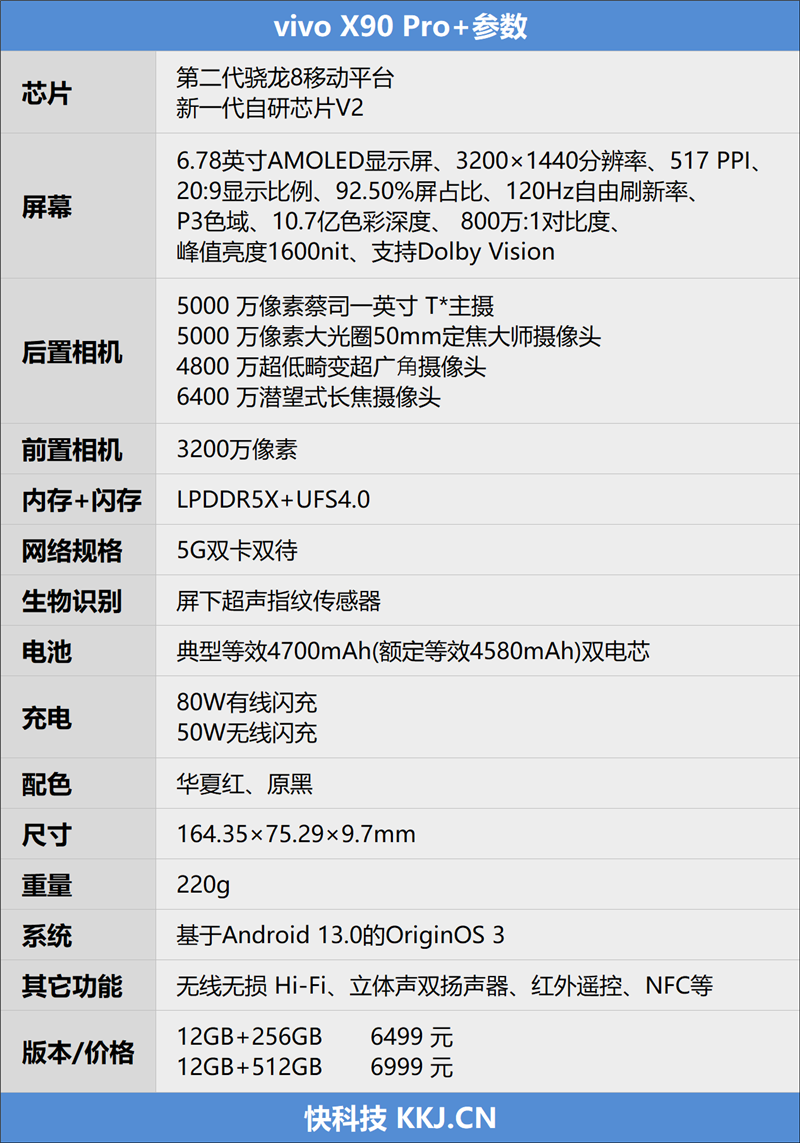 此外,80W的快充只需要半小时就能满血,完全能够满足用户日常快速回血需求,加上2K E6材质的AMOLED屏、红外遥控、超声波指纹、USB Type-C 3.2 Gen1等,在vivo X90 Pro+身上都未有缺席,各方面都拉到顶配了。