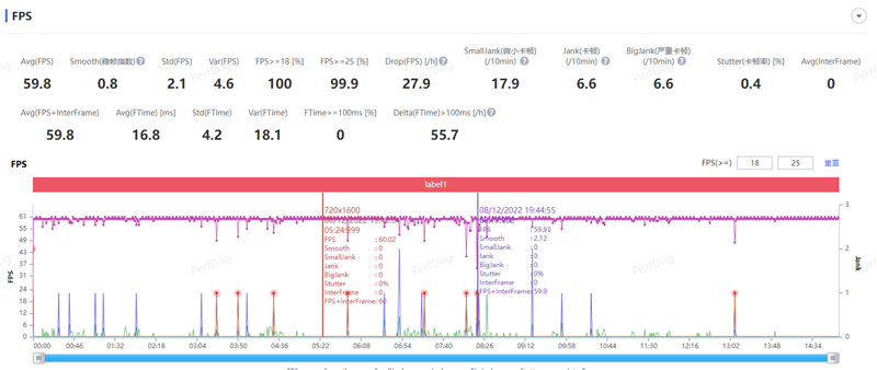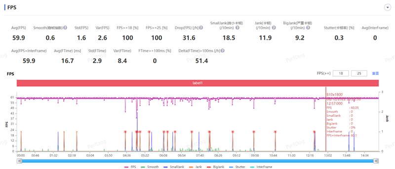 在GPU标准模式下,抓取到当前游戏画面的分辨率为1800×810,帧数曲线表现和720P画面一样,依然非常平稳,平均帧率为59.9 FPS,相差不大,也是属于满帧的水平。