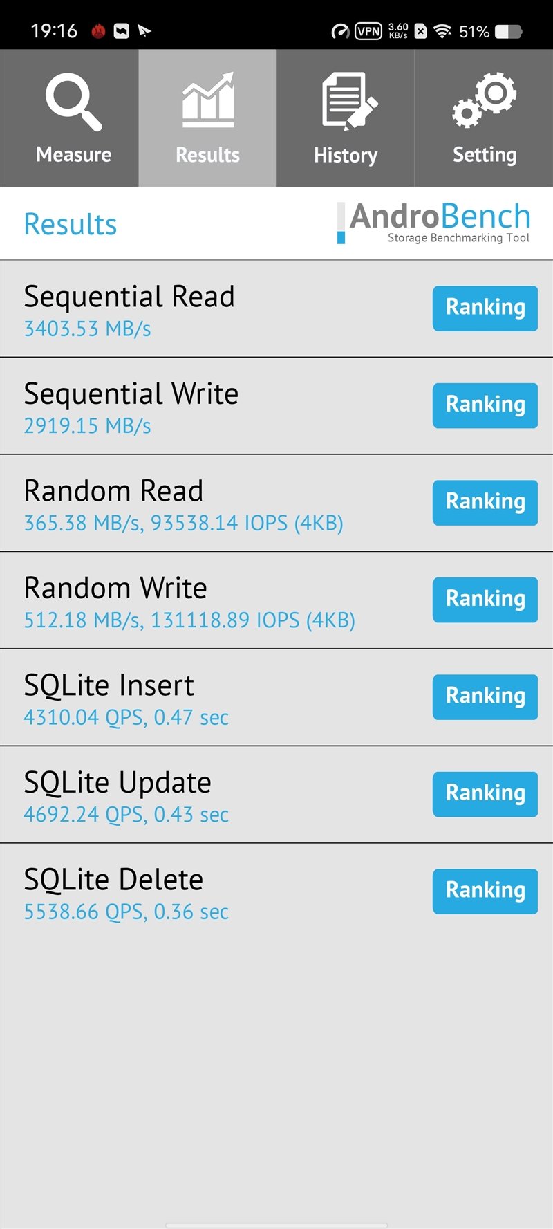 vivo X90 Pro+搭载的闪存是UFS 4.0规格,在Androbench中,顺序读取为3400MB/s、顺序写入为2915MB/s。