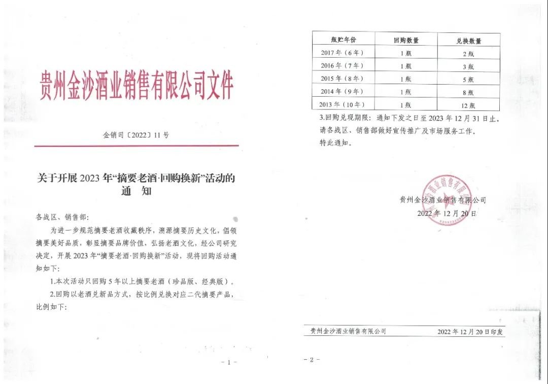 对众多白酒爱好者、消费者、收藏者们来说,老酒是时光的馈赠,也是岁月的典藏,一瓶老酒中不光蕴含着酿酒人的匠心匠艺,也凝聚着收藏者的心血与热爱。为了回馈摘要老酒收藏者、爱好者,传播摘要老酒的品牌价值与老酒文化,金沙酒业于2022年12月20日面向全社会开展 2023 年“摘要老酒·回购换新”活动。活动期间,金沙酒业将从消费者手中征集摘要老酒,并用“一瓶换多瓶”的形式为其兑换等价值的新酒,其中2013年产的摘要老酒,可兑换12瓶新酒。