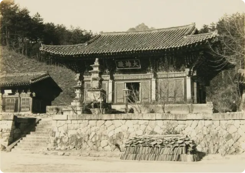 图为金刚山神溪寺,这是一座新罗时代的法兴王创建的寺庙,照片上的大雄殿是新建的,殿前的石塔则历史悠久,为一千六百多年前建寺的同期建筑。