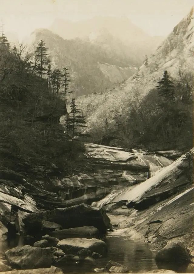 图为从神溪寺往北,沿着山间栈道前行,高峰耸立,泉瀑从高山中流下,景色极美。