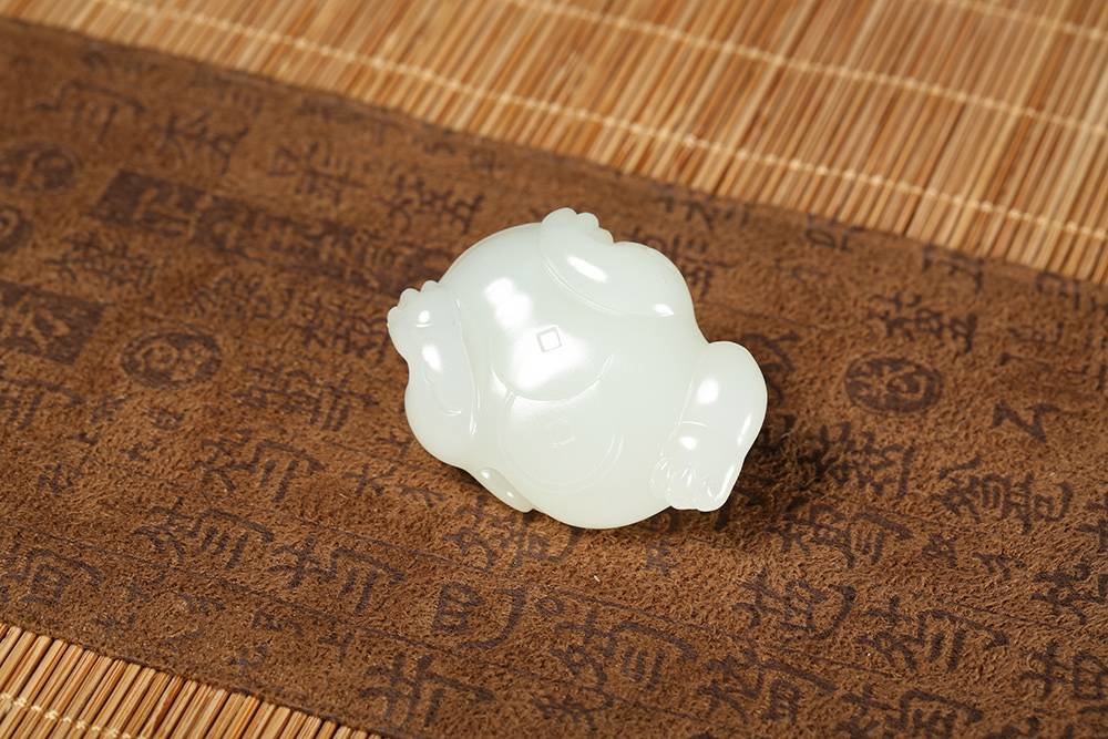 三足金蟾,财源兴旺,作品《金蟾》为上乘新疆95于田料作品,玉质细腻无瑕,油润凝糯,立体圆雕金蟾,注重体现玉材本身的美感,不拘泥于特定的传统制式,活灵活现,栩栩如生。
