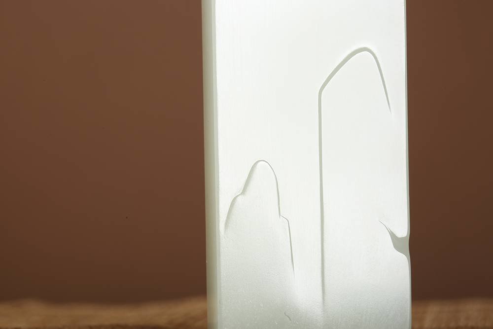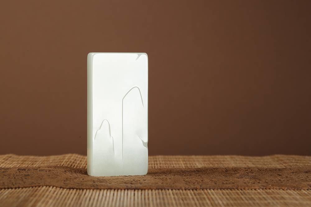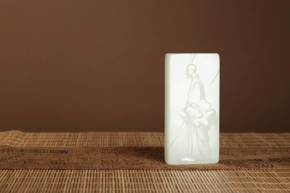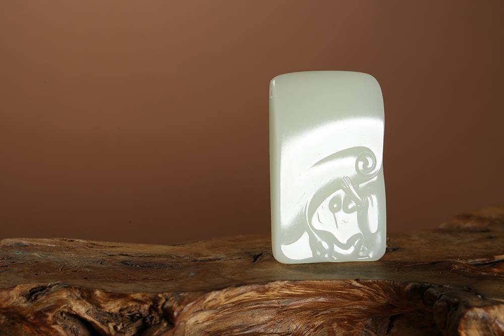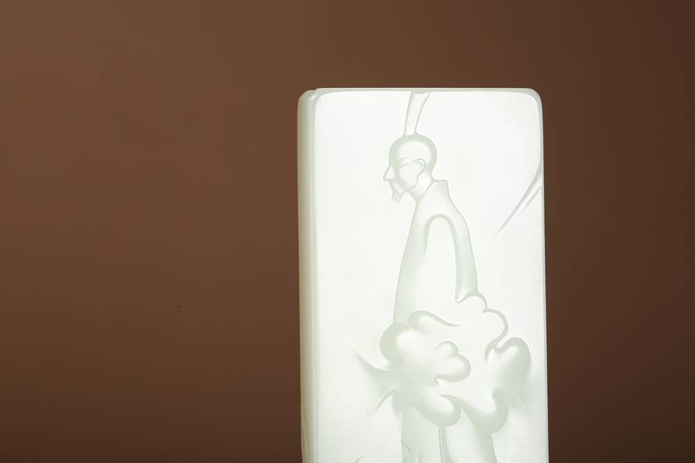 作品《高人牌》,以玉牌形制,呈创意巧思,浅浮雕人物,线条流畅,淌面圆融舒服,侧影洒脱,顶天立地,浮云到腰,寓意高人,意料之外,情理之中;背面巧琢高山峭崖,寥寥几刀,承磅礴气势,与正面高人,相得益彰。