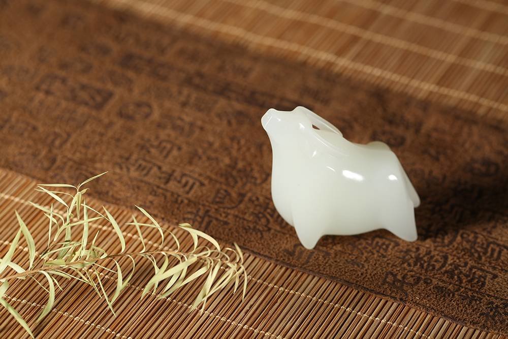 作品《牛气冲天》,以流动的线条呈现弧度的变化,简洁的立体圆雕工艺,尽现于田料的玉质美与极高的油糯度,符号化的艺术语言与传统大气的玉雕题材相结合,很是精妙。