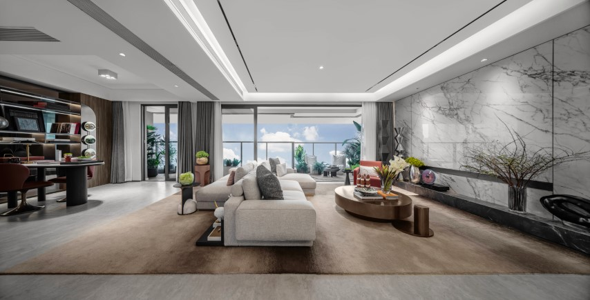 公域空间客厅采用无界方厅的突破性设计,将客厅、餐厅、开放式书房、中厨完全整合到一个方正的空间里,最大尺度的带来开阔感。玺宸上院更是在LDK的基础上加入了X空间,可以变化为书房、餐区或会谈厅,餐区、沙发区、书桌区聚集在同一个空间内,彼此相互联系又各自独立,给予生活更好的空间互动。