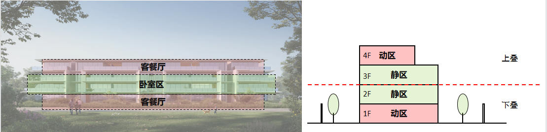 这样一来,上下叠呈现出对称式的动静分区,动区在1F,4F,静区在2F,3F,动静互不干扰,舒适度和私密度却都得到大幅提升。