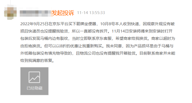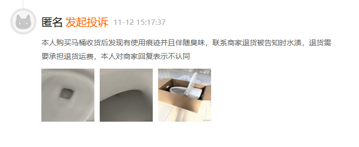 有消费者投诉称师傅上门安装时发现其新买的马桶有破损、裂纹等质量问题,但客服以超过时限为由拒绝退换。甚至有消费者指收到的马桶有使用痕迹并伴随臭味。