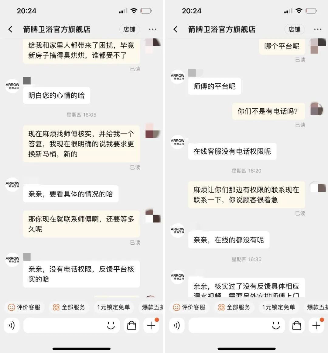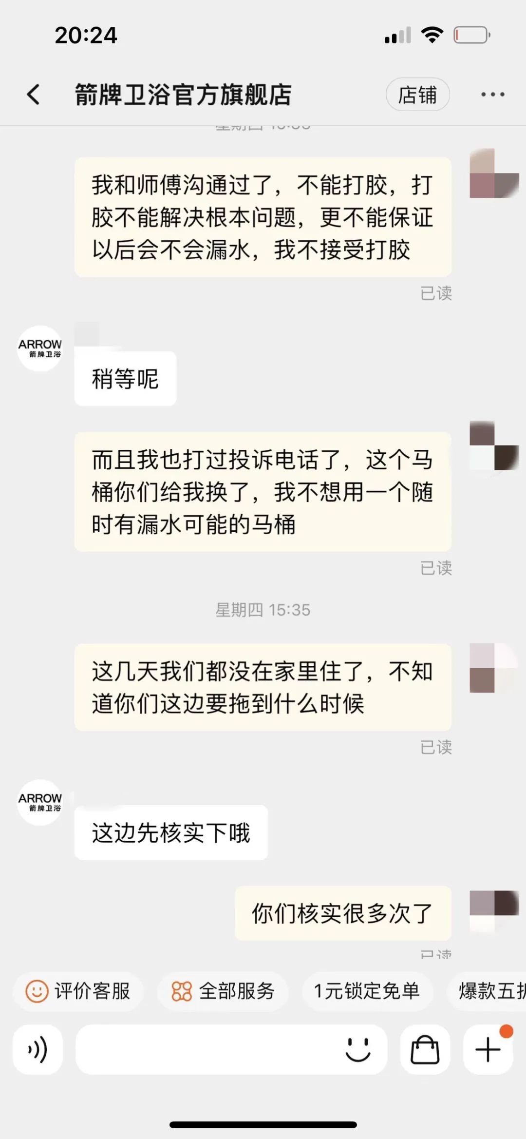 目前,邓女士对箭牌的售后服务感到不满。她的诉求是店铺尽快执行退换货。店铺则希望再次派人上门核实。邓女士认为马桶出问题,品牌方应该在售后服务上快速响应,频繁的检修已经影响到她的生活(马桶处于不能使用状态);再者她认为师傅在检修时已经给出了产品存在质量问题的看法,但没有上门的店铺客服反而再三推却。