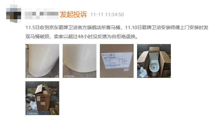 除了售后服务外,箭牌产品的“开箱环节”同样是投诉的“重灾区”。